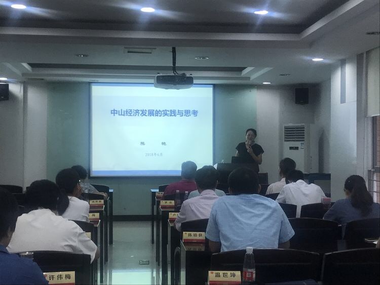 上午10:00,中山市委党校经管教研室熊艳主任为我们带来了题为“中山经济发展的实践与思考”的专题讲座。熊艳主任的讲座主要从中山经济发展的概况、中山经济发展的现状与特点、中山经济转型的方向与路径,三个方面为我们进行了详细的讲述。熊主任讲到,中山经济发展的特点主要呈现以下几个特征:一是产业结构以第二产业为主,二是工业结构呈现支柱产业多元化,三是产业布局的集群化发展特征明显,四是经济类型以民营和外资为主,五是企业规模以中小企业为主。目前,中山正在朝着构建重大产业发展平台和加快推进传统产业转型升级的方向,实现经济转型发展。具体来讲,就是要在集群技术创新、传统产业智能化改造和制造业与服务业融合发展三个方面,为中山传统产业转型升级,构筑有效路径。
