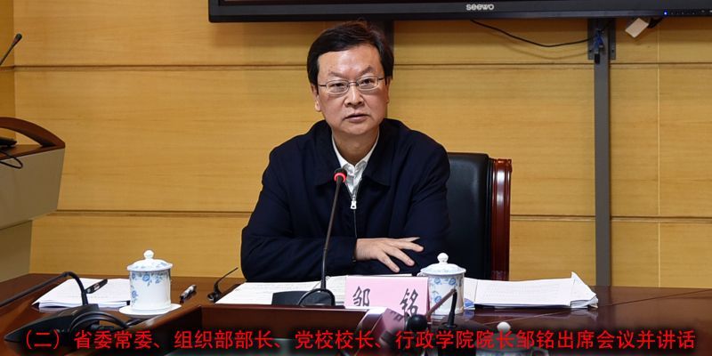 2018年2月1日上午,校院委领导班子召开2017年度民主生活会。省委常委、组织部部长、党校校长、行政学院院长邹铭出席会议并讲话。校院委领导班子成员杨汉卿、程志彪、林栋才、余甫功、潘向阳、方真参加会议。省纪委驻省委组织部纪检组组长王力伟,省委组织部干部三处处长萧卫文、组织一处调研员黄玉强,校院副巡视员等列席会议。会议由常务副校院长杨汉卿同志主持。
