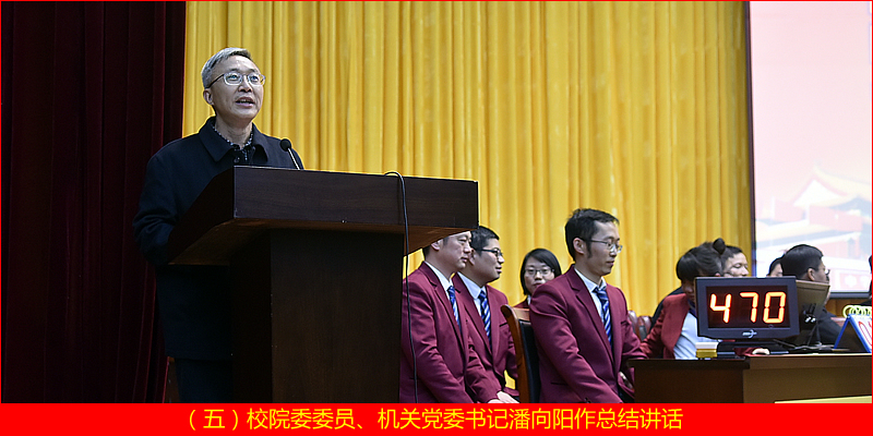 潘向阳同志在总结讲话中代表校院委和直属机关党委对获奖的党支部和党员代表表示祝贺,充分肯定了参赛选手的理论知识素养、现场应变能力和团队协作精神。认为竞赛活动准备充分、组织有序,全体党员通过学习和比赛进一步深化了对十九大精神的理解和把握,增强了“四个意识”,坚定了“四个自信”,激发了干事创业的激情和活力,取得了预期效果。希望校院全体党员干部以这次竞赛活动为契机,不忘初心,牢记使命,砥砺奋进、担当作为,在新时代创造新佳绩,为推动校院事业科学发展做出新贡献。
