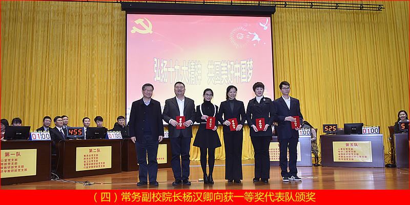 经过必答题、抢答题、风险题和观众答题四个环节的激烈角逐,第五代表队(由人事处、培训二部、省情教研部、决策咨询研究中心和图书馆党支部组成)获得一等奖;第六代表队(由研究生部、干部教育学院、中国特色社会主义研究所、校院刊编辑部党支部组成)和第四代表队(由科研处、信息网络中心、中共党史和党建教研部、社会和文化教研部、信息技术教研部党支部组成)获得二等奖;第一代表队(由办公室、进修部、哲学教研部、经济学教研部党支部组成)、第二代表队(由教务处、财务处、保卫处、管理学教研部、行政学教研部党支部组成)、第三代表队(由总务处、培训一部、法学教研部、科学社会主义教研部党支部组成)获得三等奖。校院领导分别为获得一、二、三等奖的代表队颁发了获奖证书。