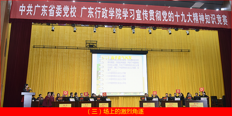 本次知识竞赛由校院直属机关党委主办。28个党支部经过前一阶段的层层选拔,推荐了30名党员代表组成六支队伍参加比赛。中共党史和党建教研部梁道刚、科学社会主义教研部郭丽兰、陈晓运三位老师组成嘉宾组,对比赛情况进行现场点评,对十九大精神进行深入解读。比赛过程中,各位选手热烈讨论、踊跃抢答,精彩的对答频频引发现场观众的热烈掌声。竞赛中还设置了观众答题环节,现场随机抽点观众答题,全面检验广大党员对十九大精神的掌握情况。