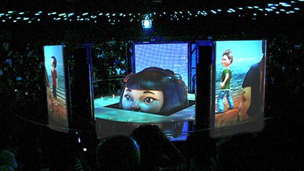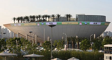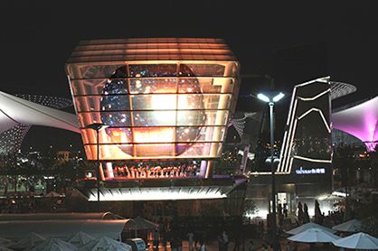 信息通信馆的外立面由来自废旧光盘的聚碳酸酯制成并采用LED变色效果 . |